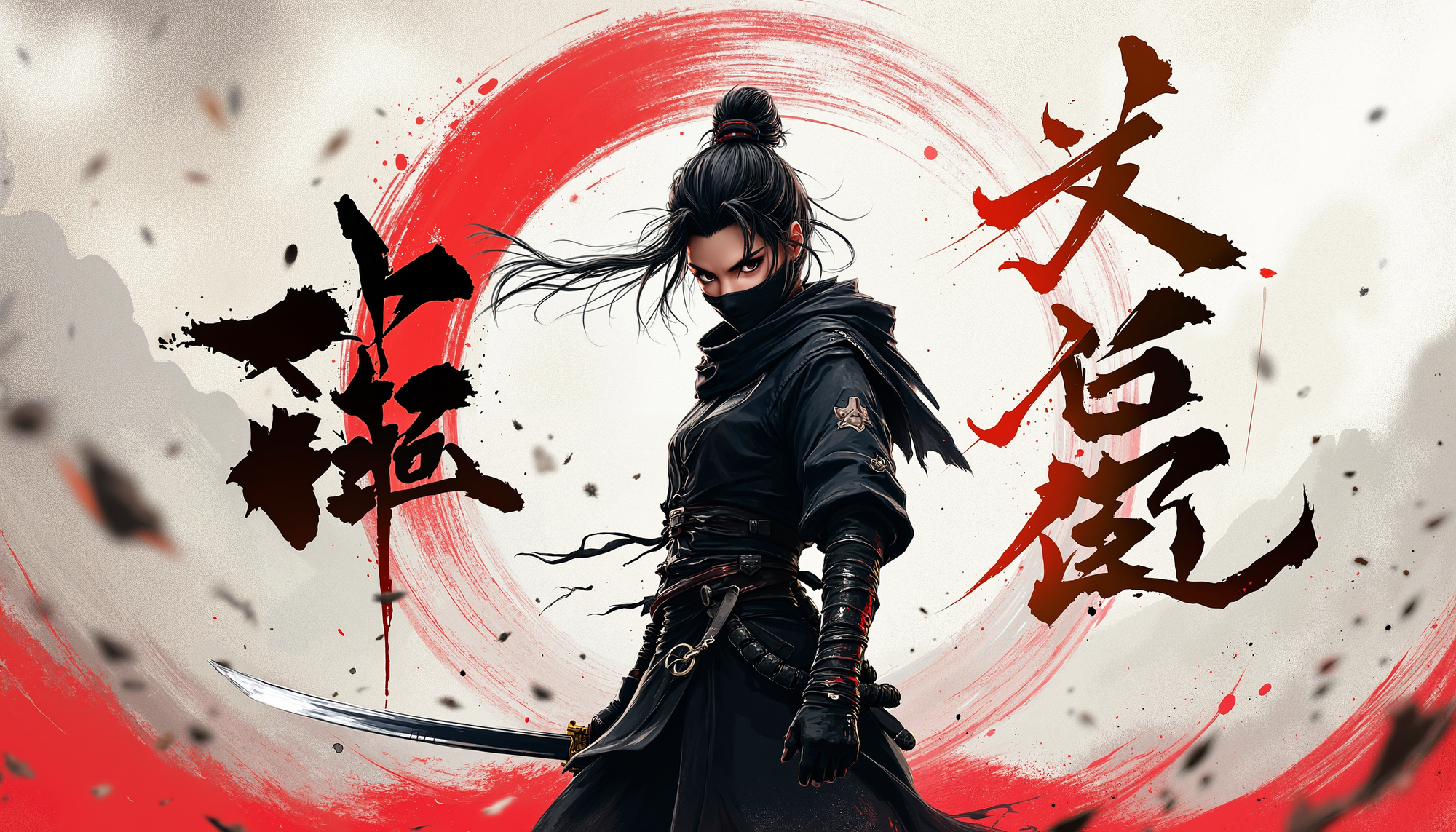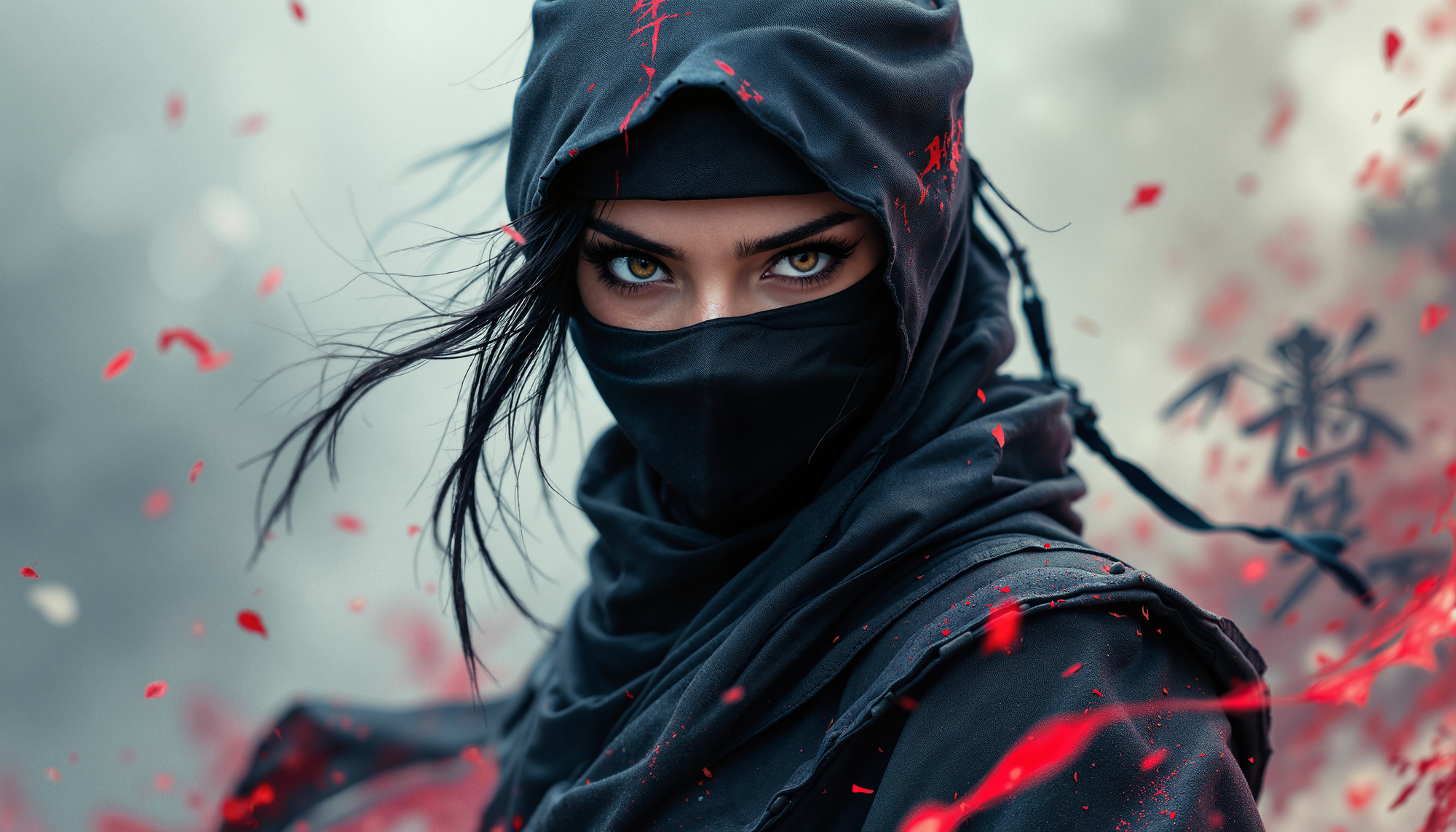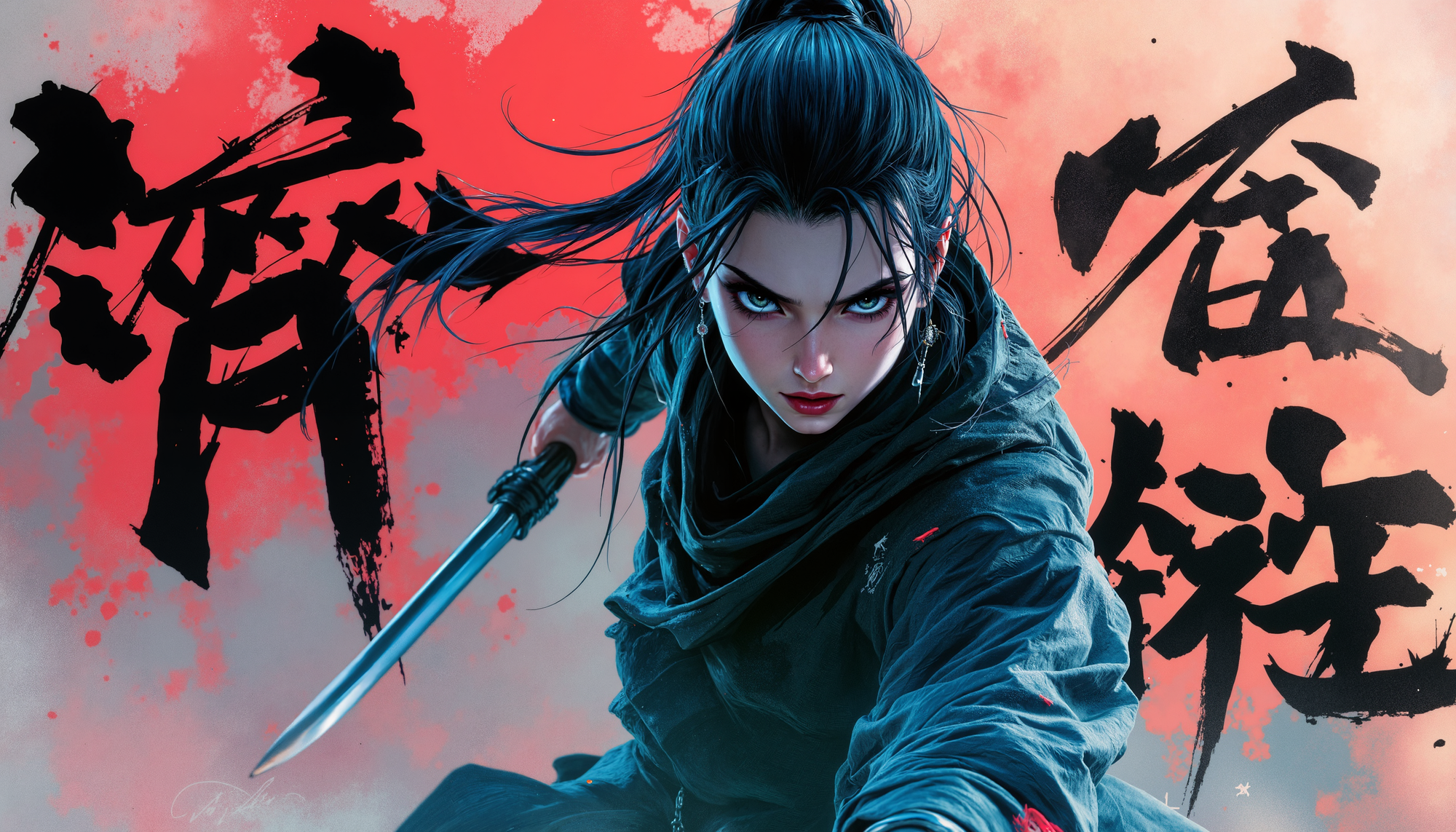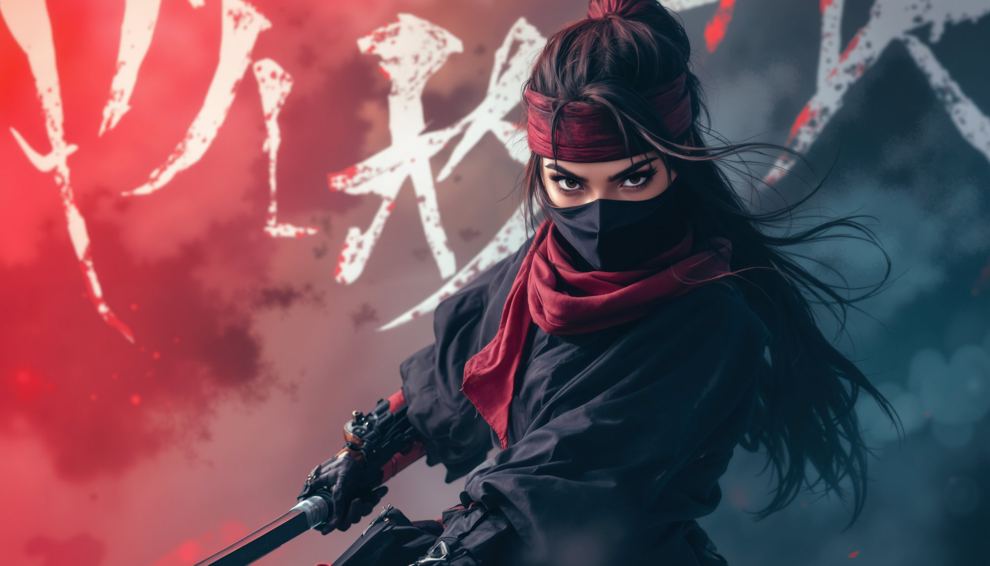4k Computer wall paper. A Ninja girl warrior stands front and centre in a battle pose. Her eyes intense as she looks at the viewer. The background is a blend of complimentary colours, with artistic Japanese lettering