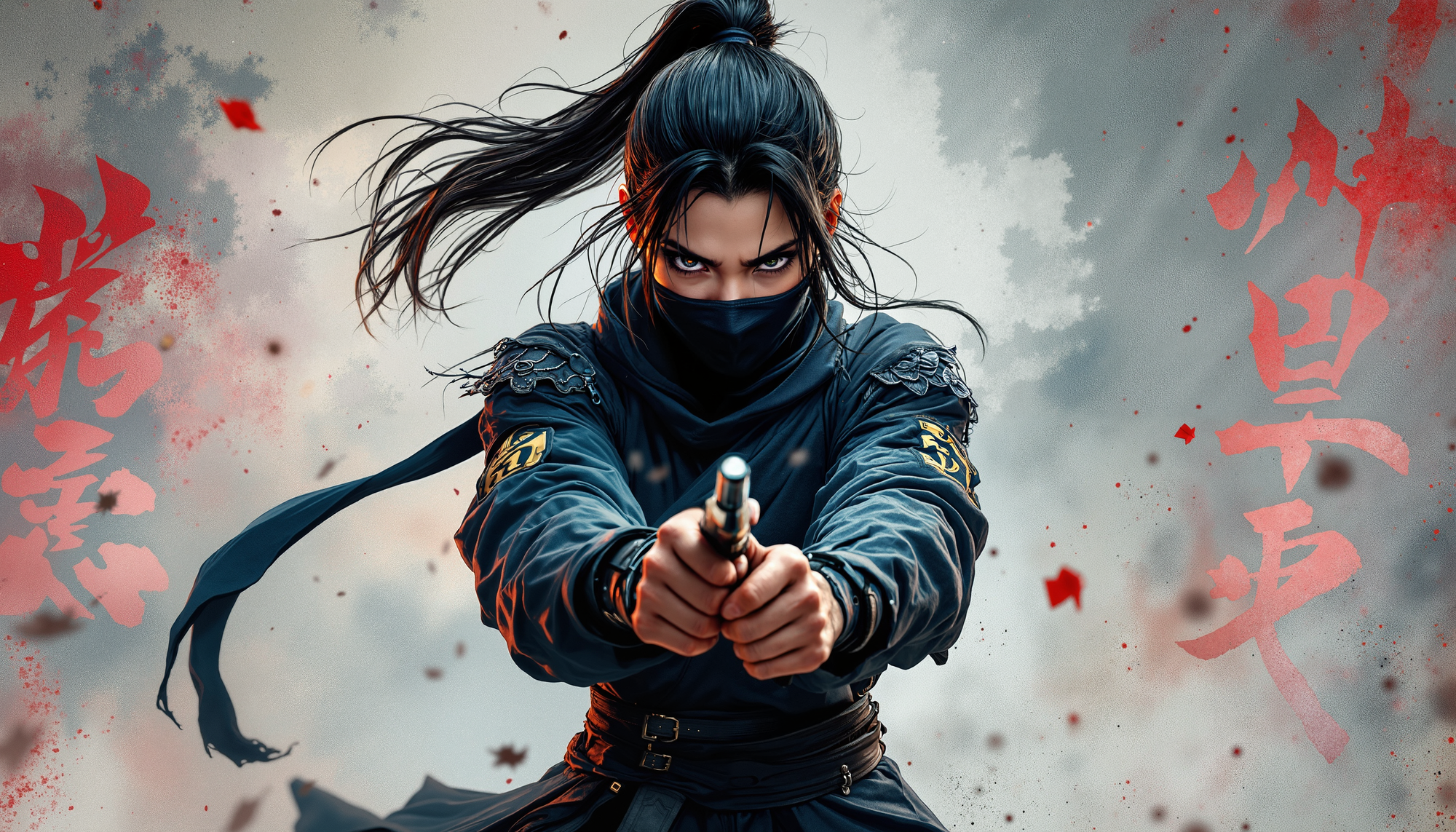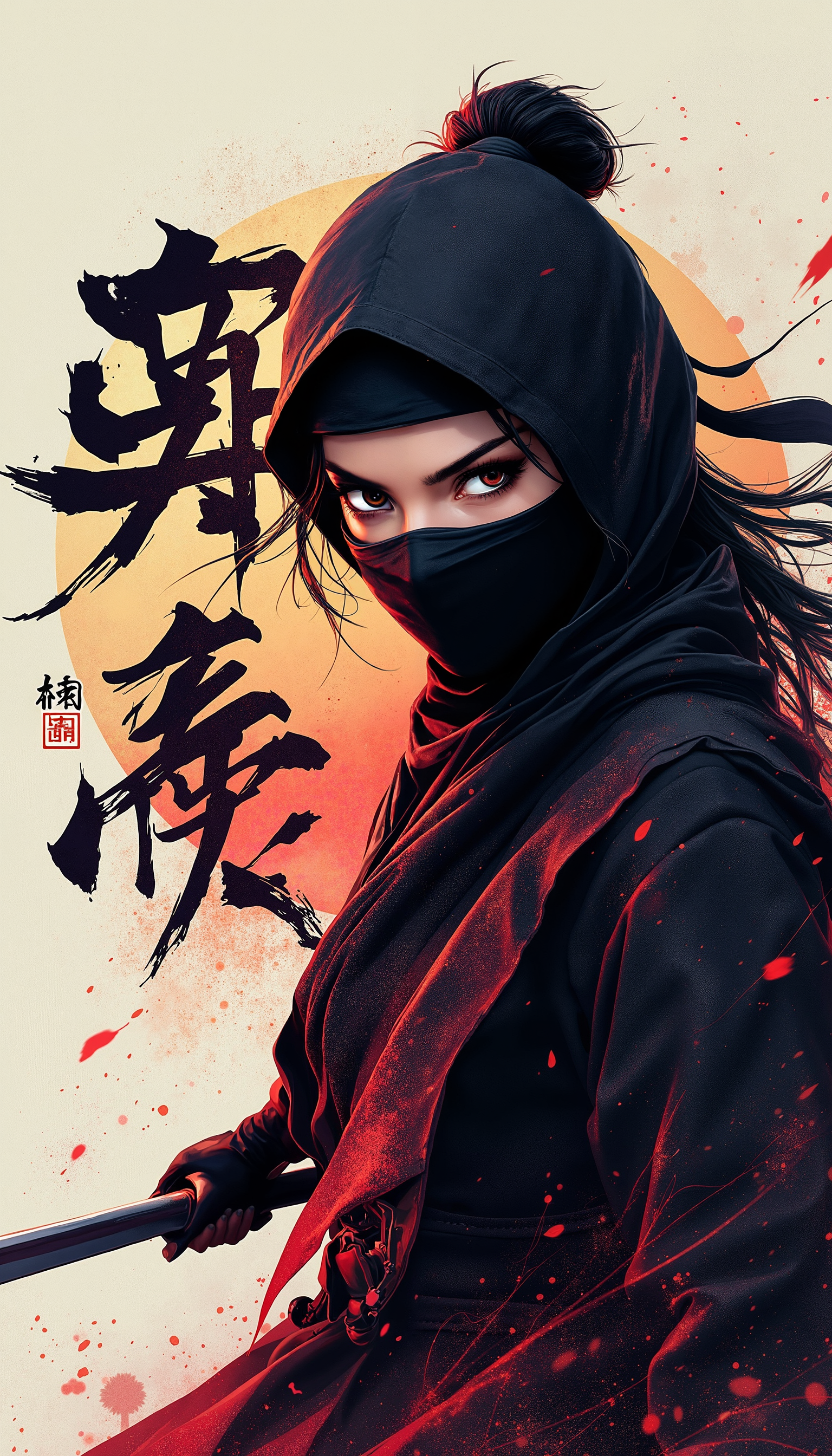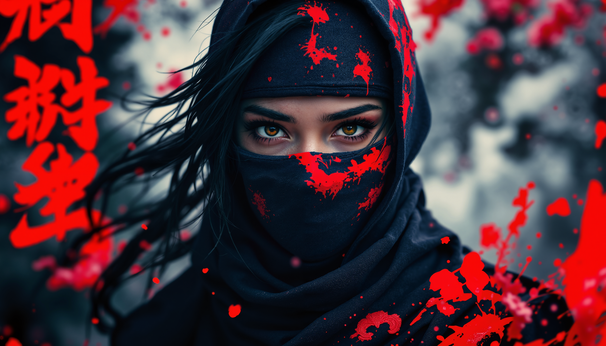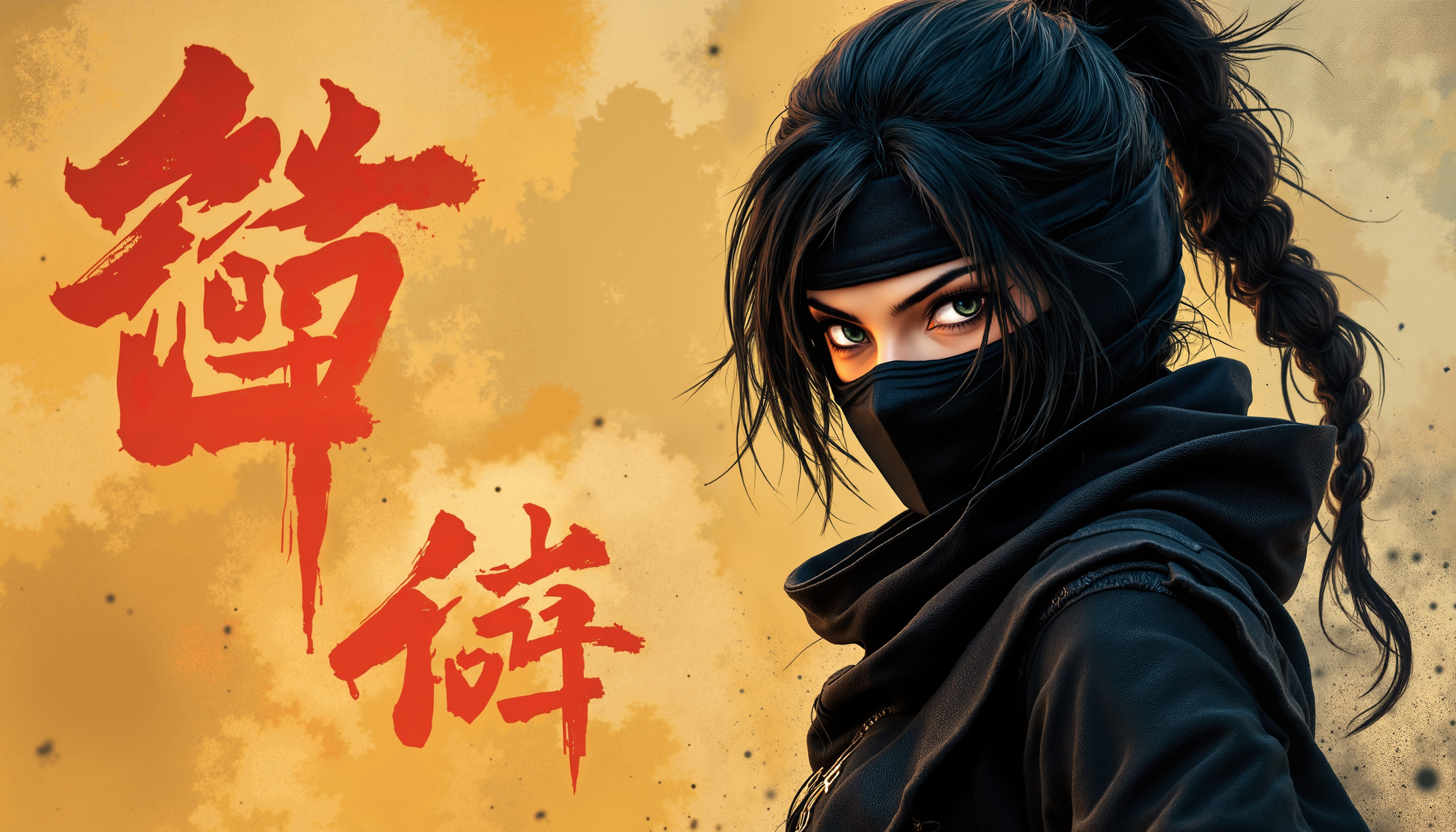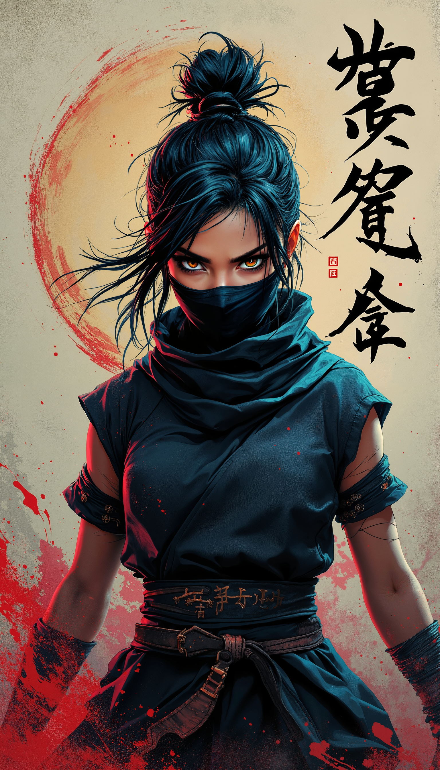 4k Computer wall paper. A Ninja girl warrior stands front and centre in a battle pose. Her eyes intense as she looks at the viewer. The background is a blend of complimentary colours, with artistic Japanese lettering