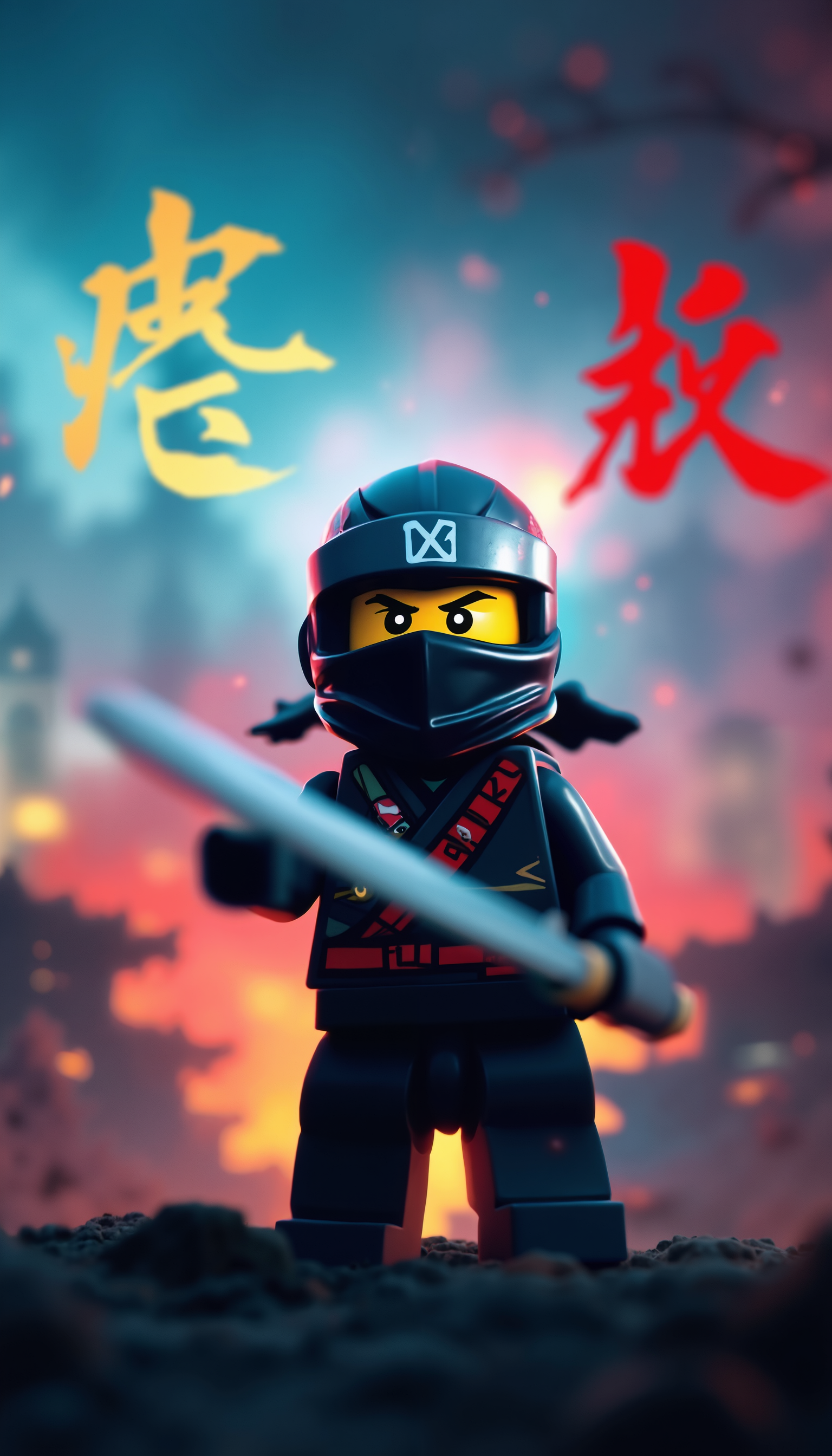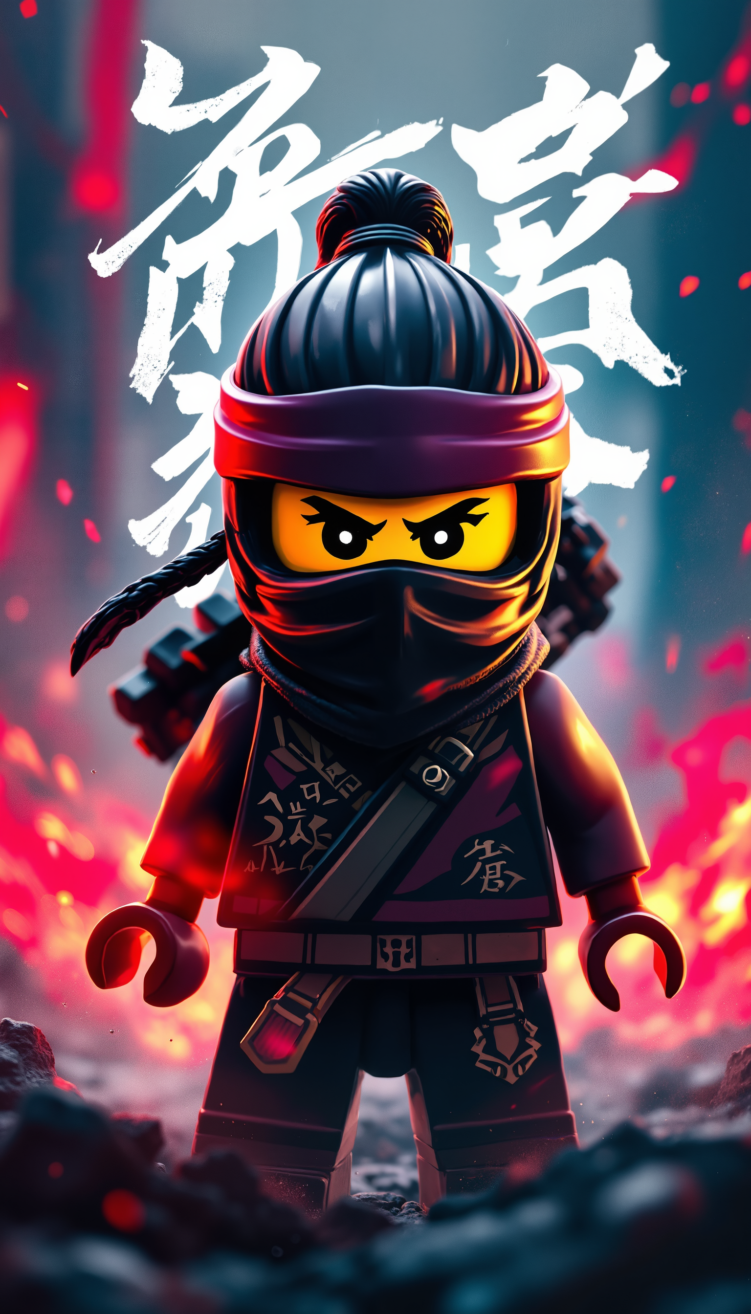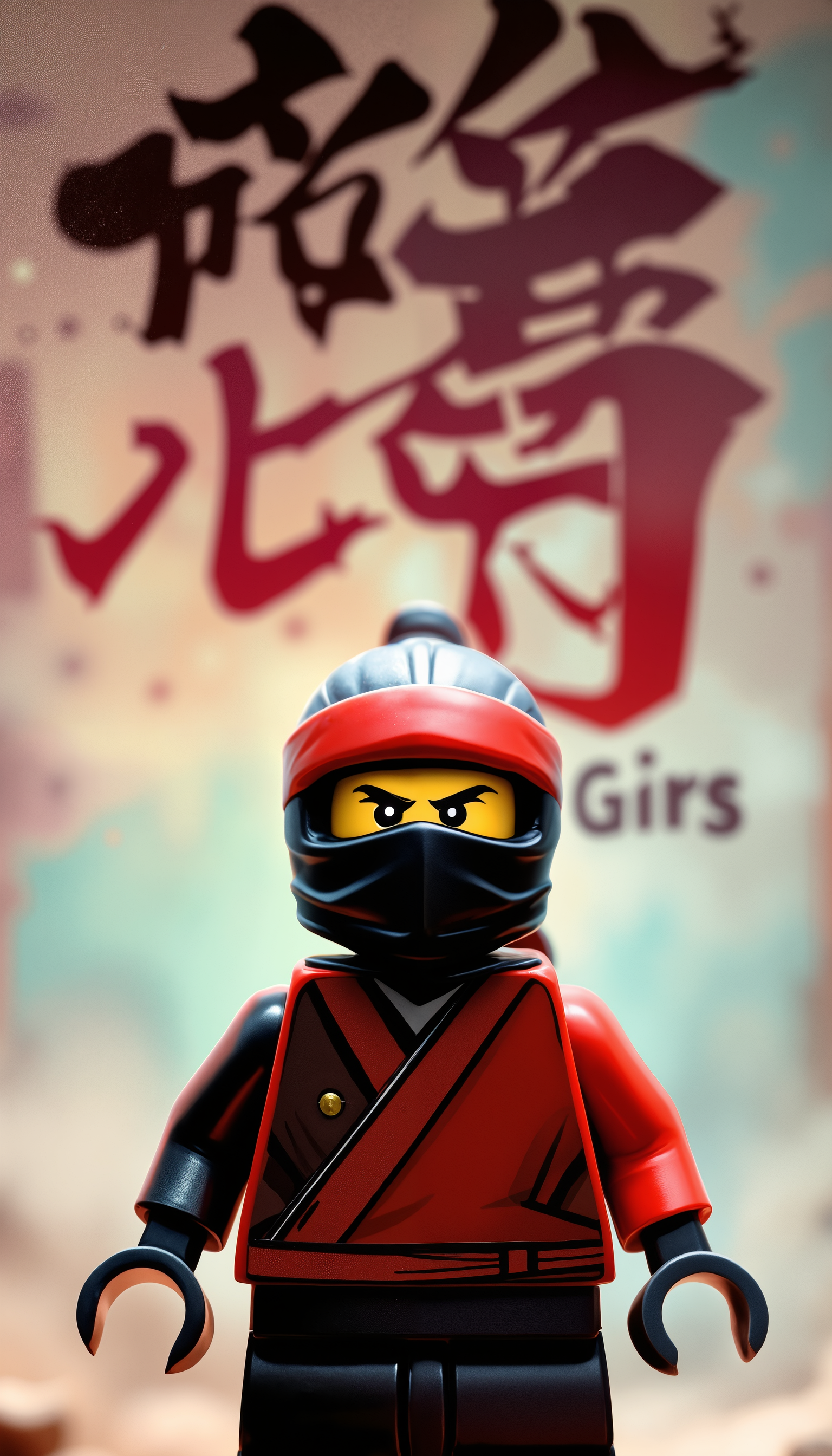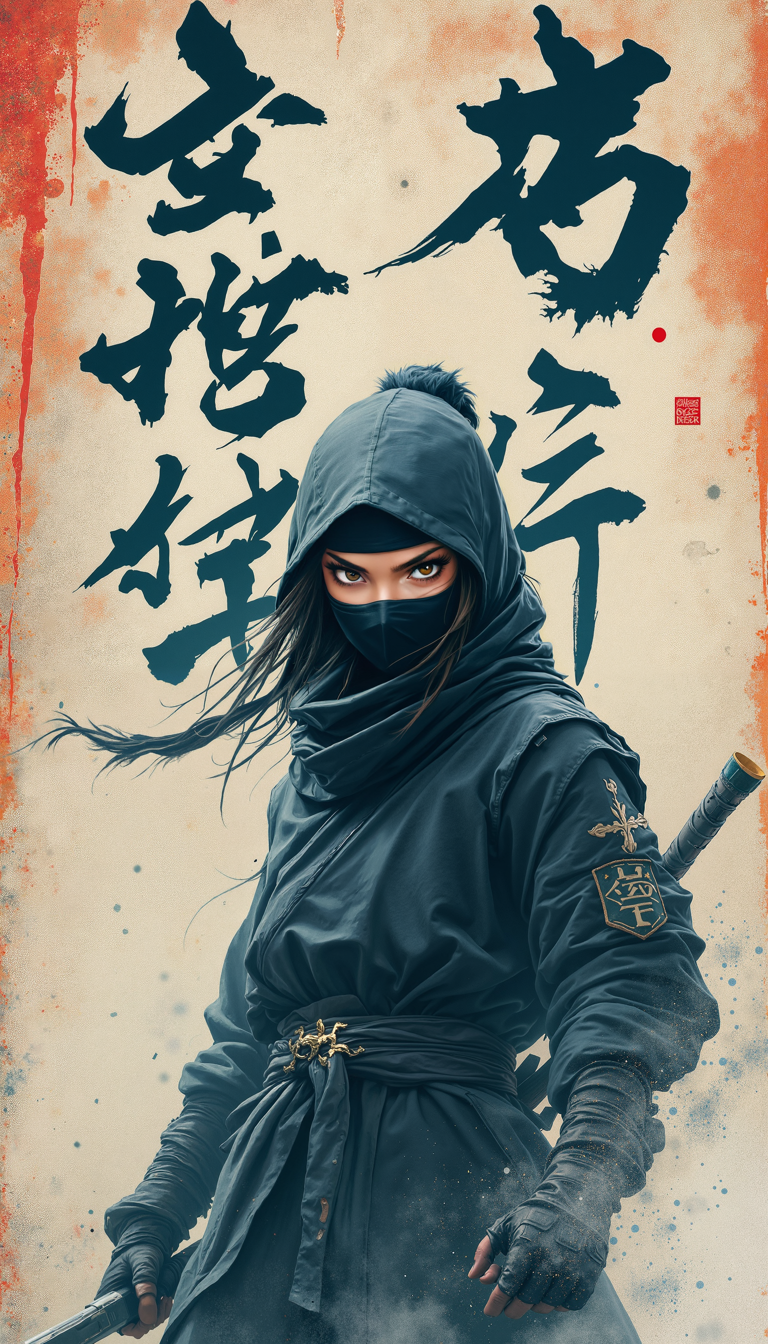 4k Computer wall paper. A Ninja girl warrior stands front and centre in a battle pose. Her eyes intense as she looks at the viewer. The background is a blend of complimentary colours, with artistic Japanese lettering